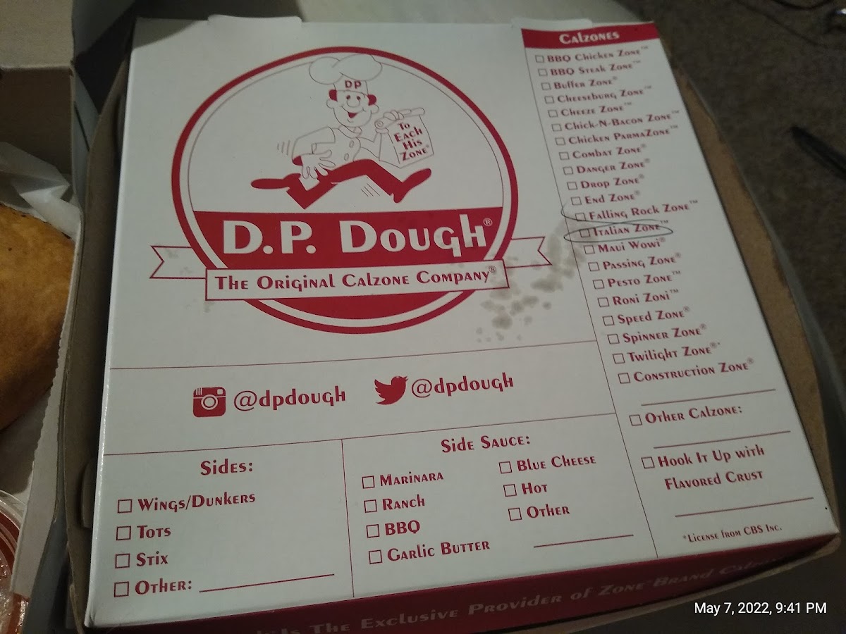 “ I had the best calzone! The crust was golden and crunchy outside and tender and chewy inside. The sauce was not too sweet and it had just the right combination of peppers, onions, pepperoni and mushrooms. DP is the only place open as late as I stay up. I did not share my calzone because it was Too Good! But I certainly will spread the word and share next time. ”